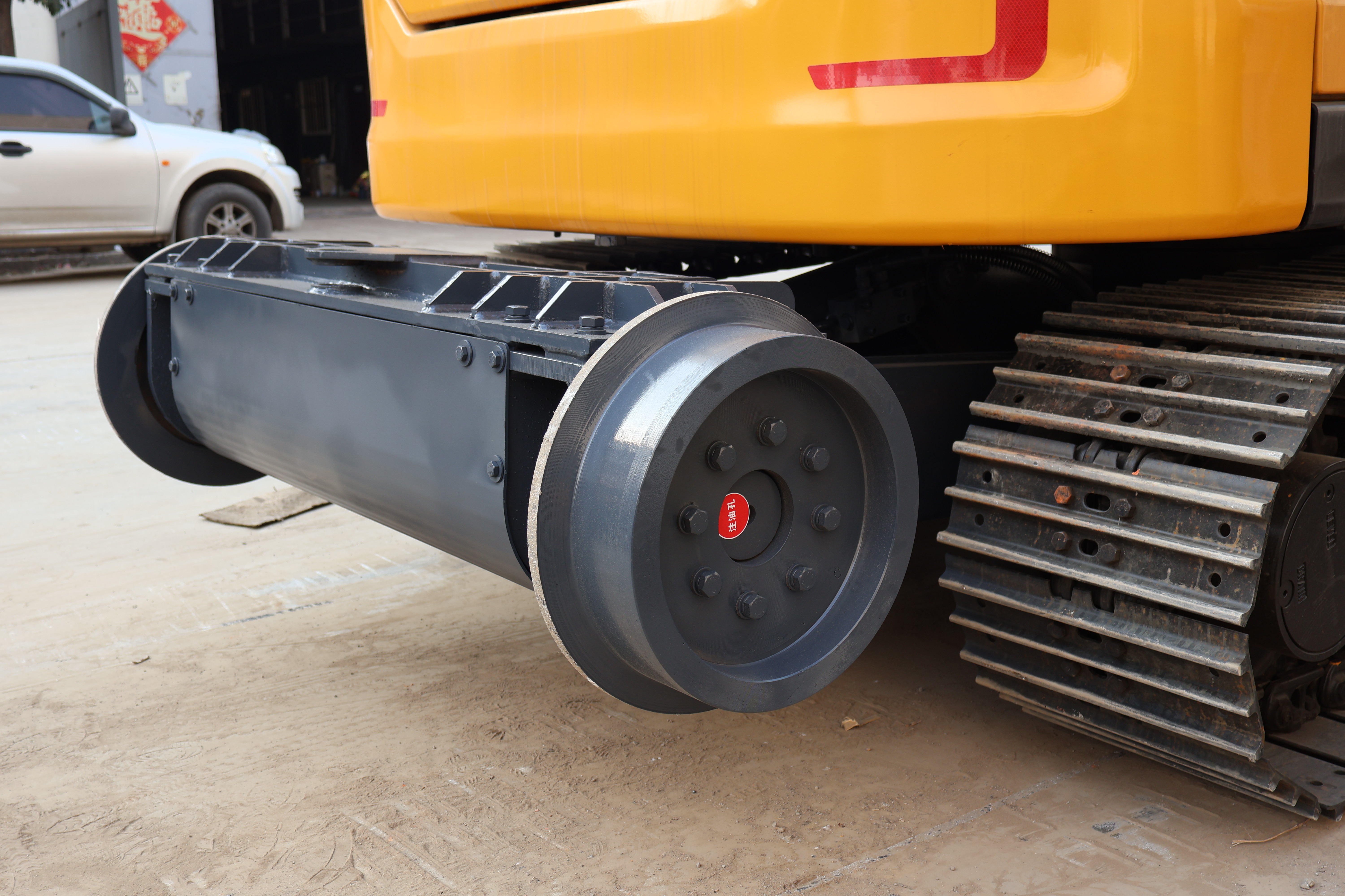 挖機(jī)開(kāi)到鋼軌上,支起支架,讓軌道輪放在鋼軌上。